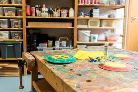 Ein separater Werkraum lädt zur kreativen Entfaltung ein. Der Umgang mit verschiedenen Werkzeugen, Materialien sowie das Gestalten mit Farben stehen hier im Mittelpunkt.